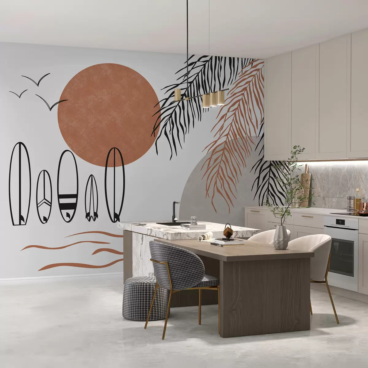 Тапете за зид Даске за сурфовање, цртање линија палминих грана, црне и црвене боје бр. w00958