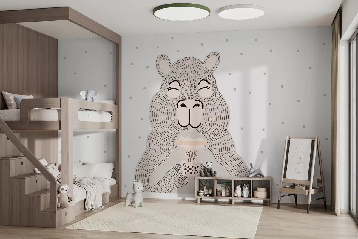 Тапете за зид Велика слатка беж капибара са мајицом са мехурићима у минималистичком стилу на белој тачканој позадини бр. w01122
