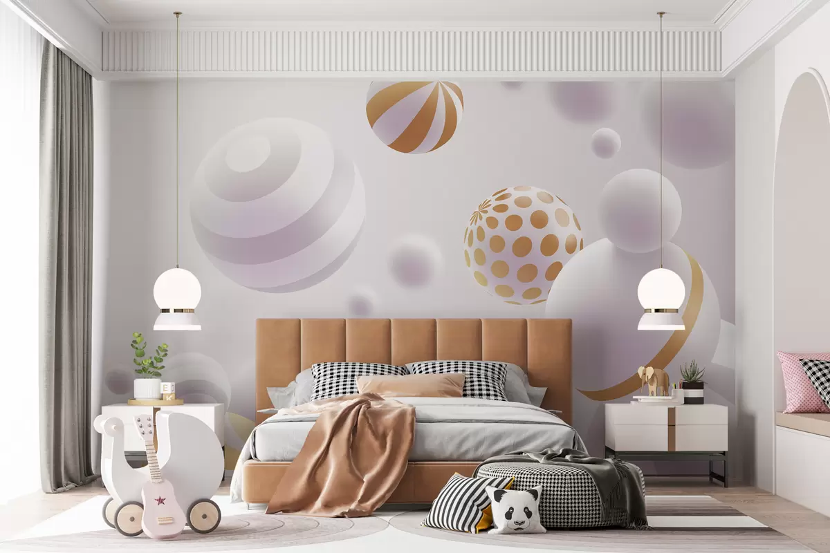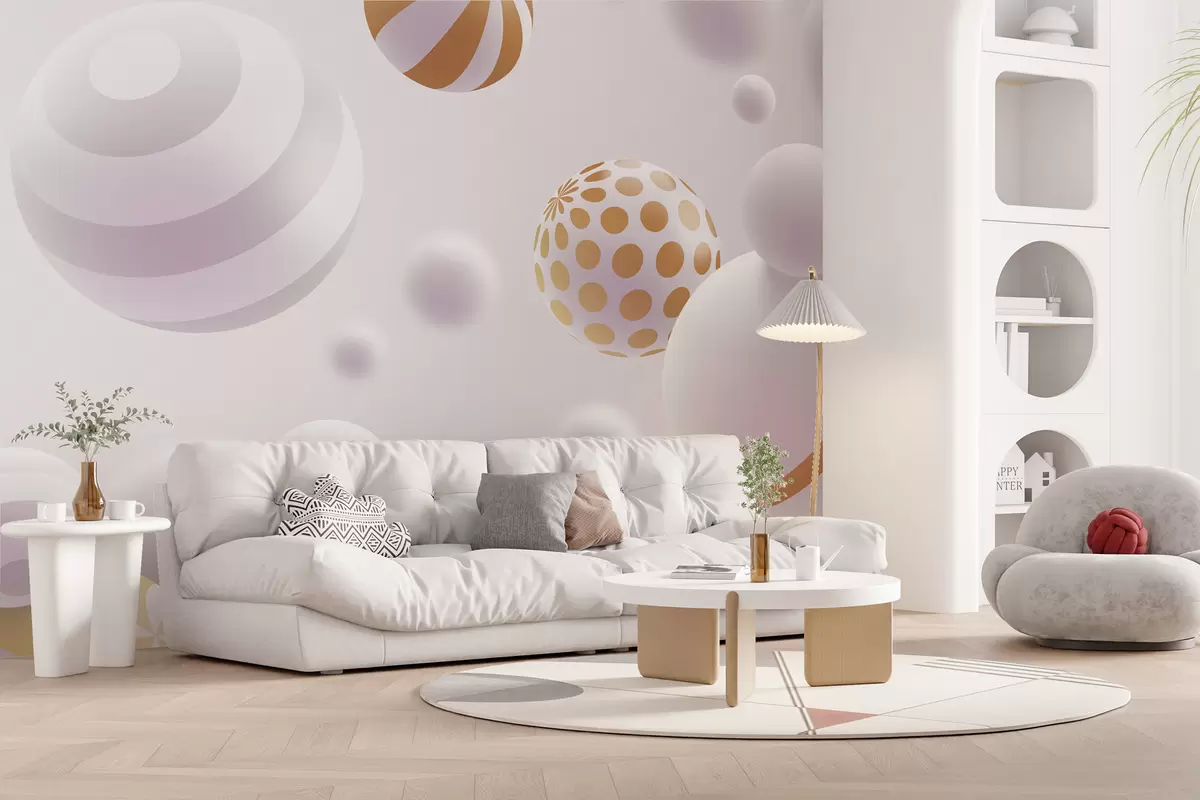 Тапете за зид Волуметричне летеће сфере у 3Д стилу у светлосивим тоновима са наранџастим акцентима бр. w01148