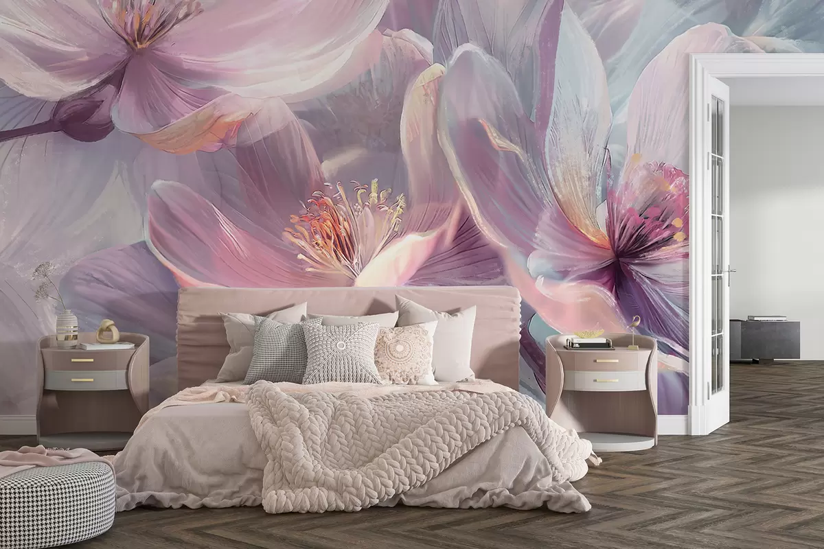 Тапете за зид Деликатно прозирно пастелно неонско светло розе и бело цвеће са меком, замућеном позадином бр. w01307