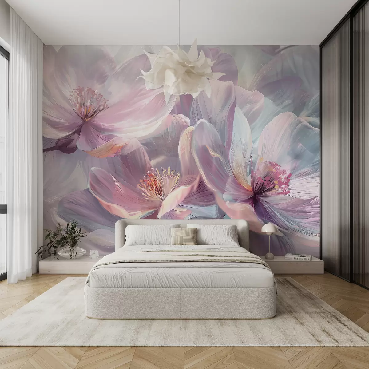 Тапете за зид Деликатно прозирно пастелно неонско светло розе и бело цвеће са меком, замућеном позадином бр. w01307