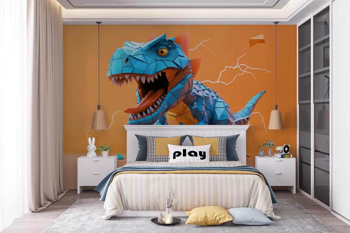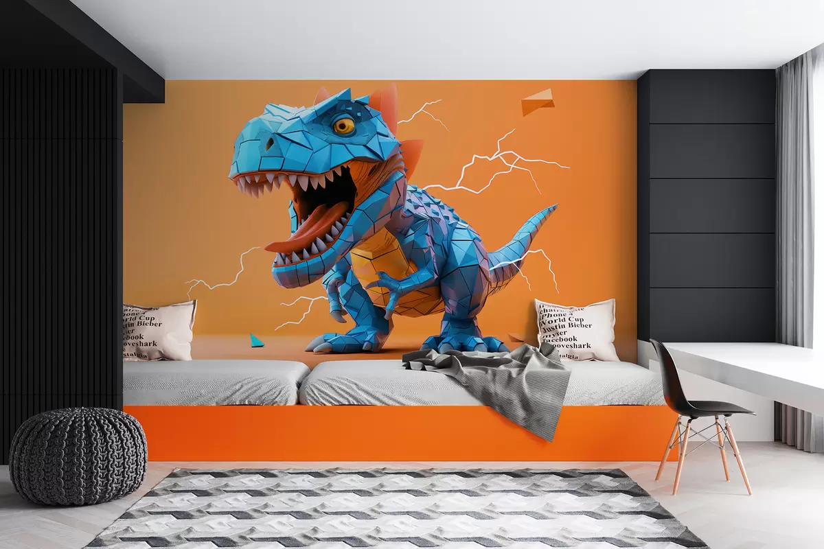 Тапете за зид Свирепи диносаурус са ударом грома у жуто-плавим бојама бр. w01333v1