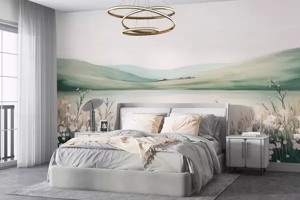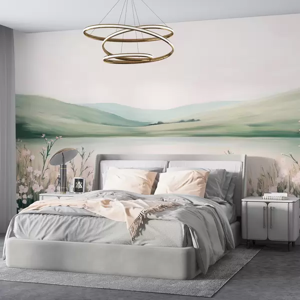 Тапете за зид Цветна ливада, пејзаж природе, језеро, розе цвеће, зелена брда бр. w01387