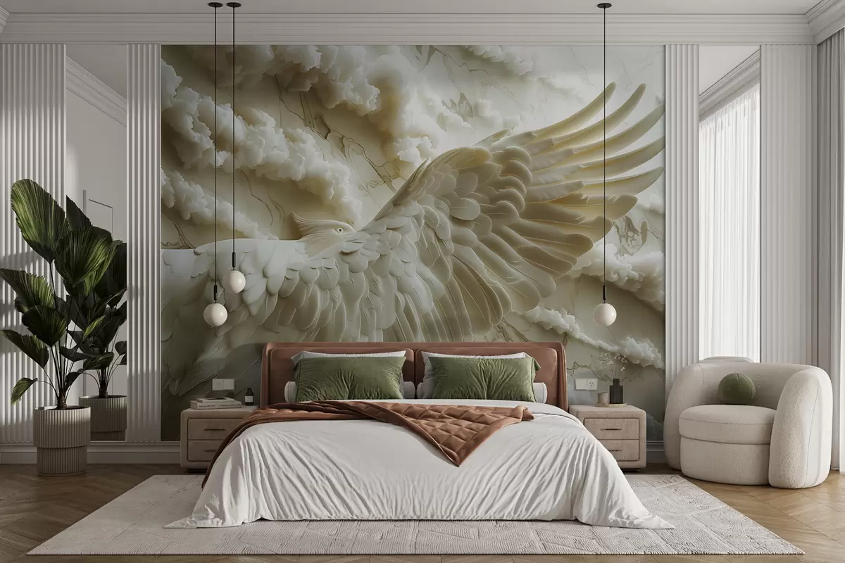 Тапете за зид 3Д летећи бели орао на позадини облака и мермера бр. w01476