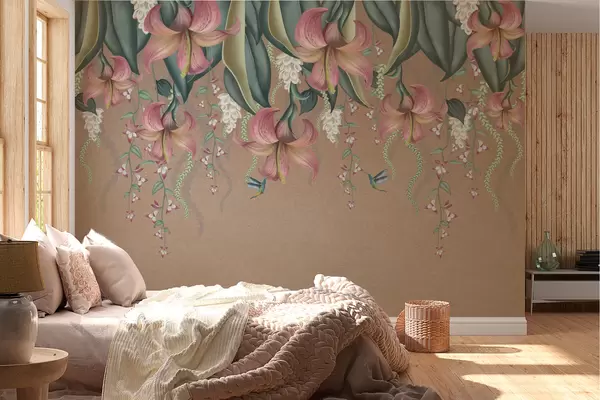 Тапете за зид Деликатни ботанички мотив са висећим љиљанима, цвећем и колибрима на грунге зиду бр. w01523