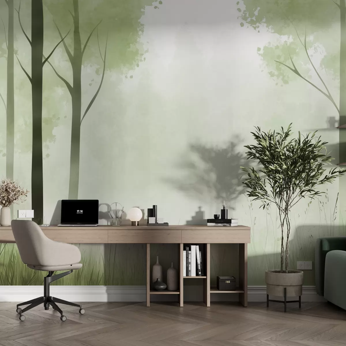 Тапете за зид Акварел шума, магла, дрвеће, трава, природни пејзаж, зелена боја бр. w01563v2