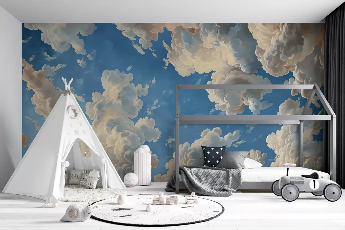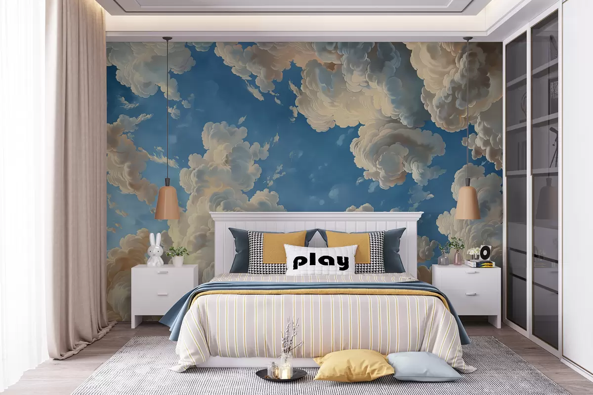 Тапете за зид Хмари у топлим кремастим, нежно бресквастим и бледим нијансама на позадини дубоког, светло плавог неба. бр. w01583