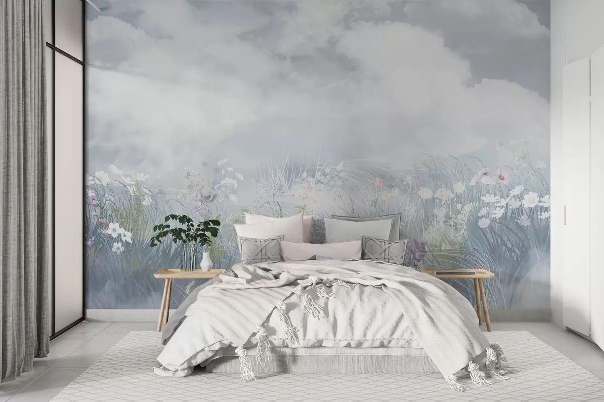 Тапете за зид Дивље цвеће и трава са балканским небом и облацима бр. w01624