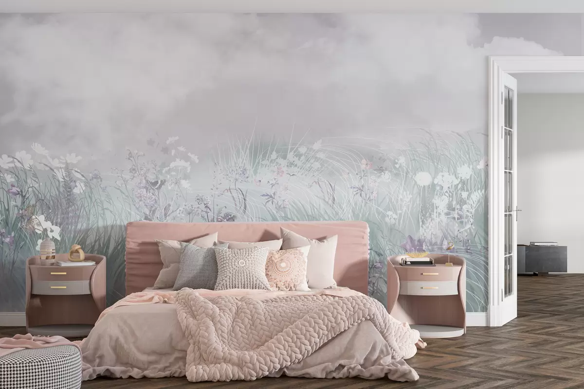Тапете за зид Дивље цвеће и трава са ружичастим небом и облацима бр. w01624v1
