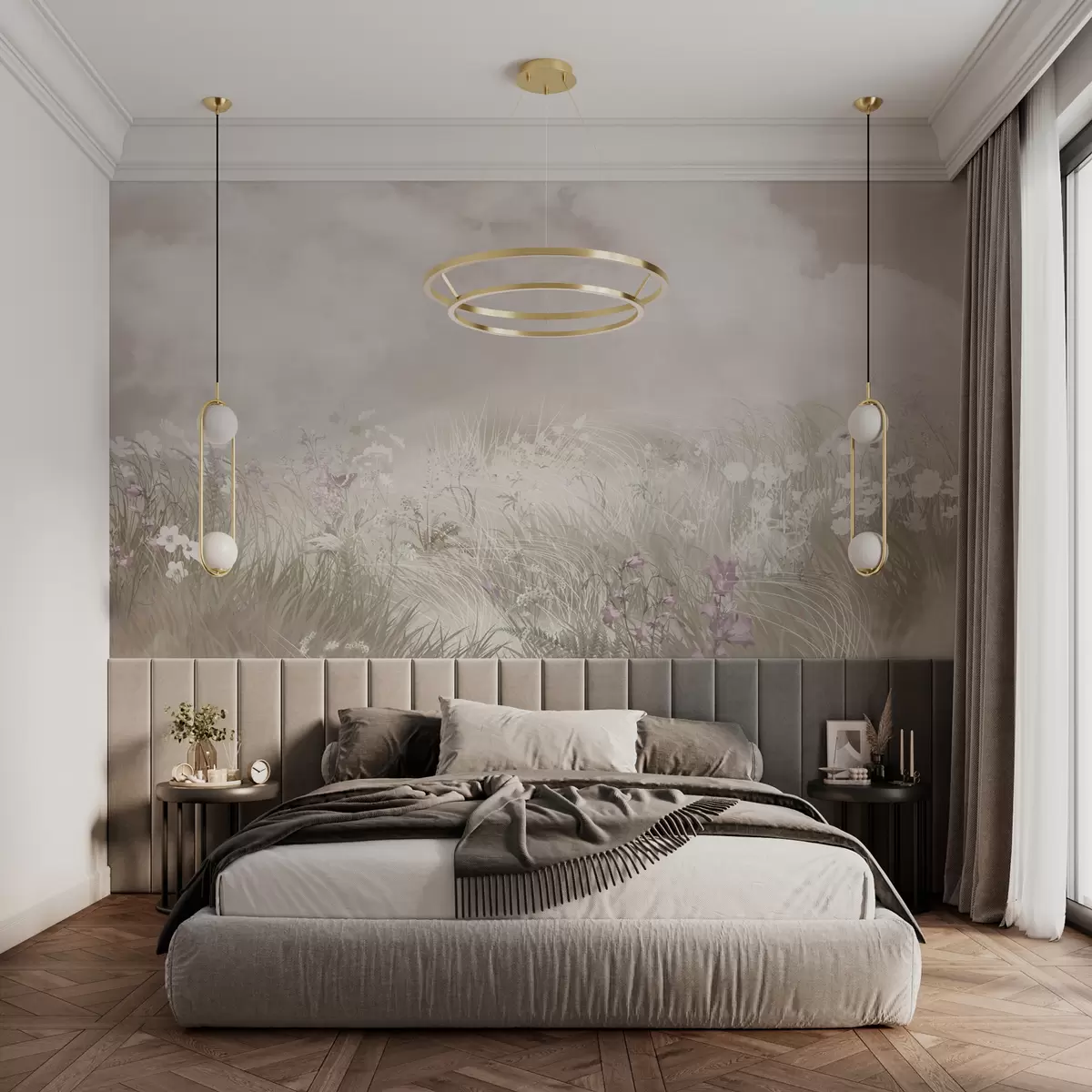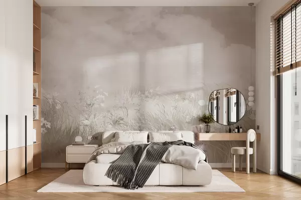 Тапете за зид Дивље цвеће и трава са бледо ружичастим небом и облацима бр. w01624v4