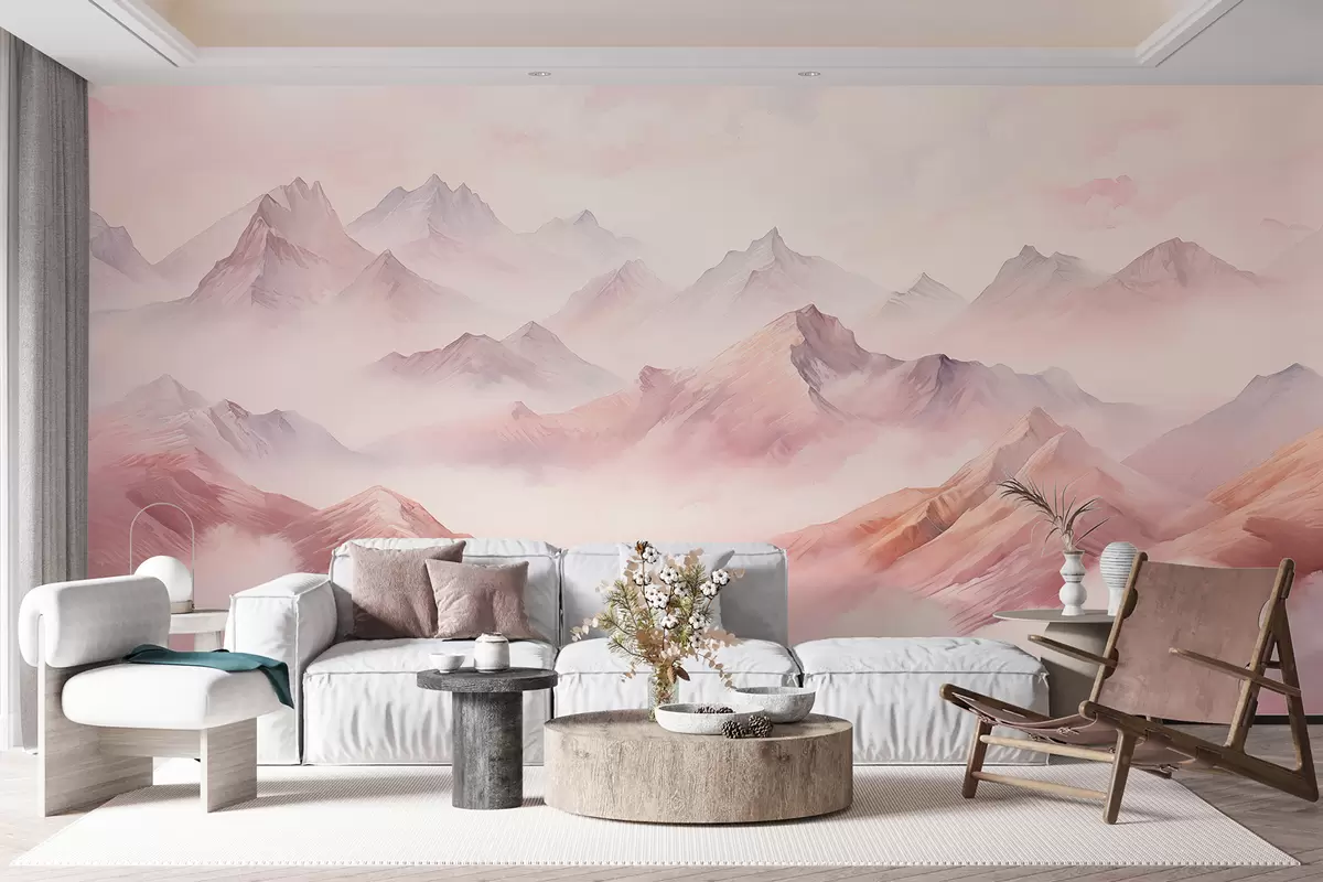 Тапете за зид Планине са облацима, акварел, нежне беж и розе боје бр. w01790