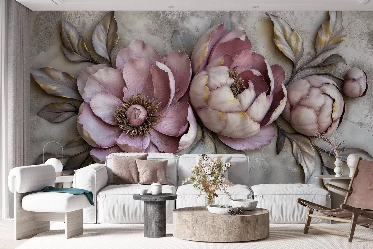 Тапете за зид Цветни љубичасти божури са листовима и латицама пригушених пастелних боја, винтаге стил бр. w01825