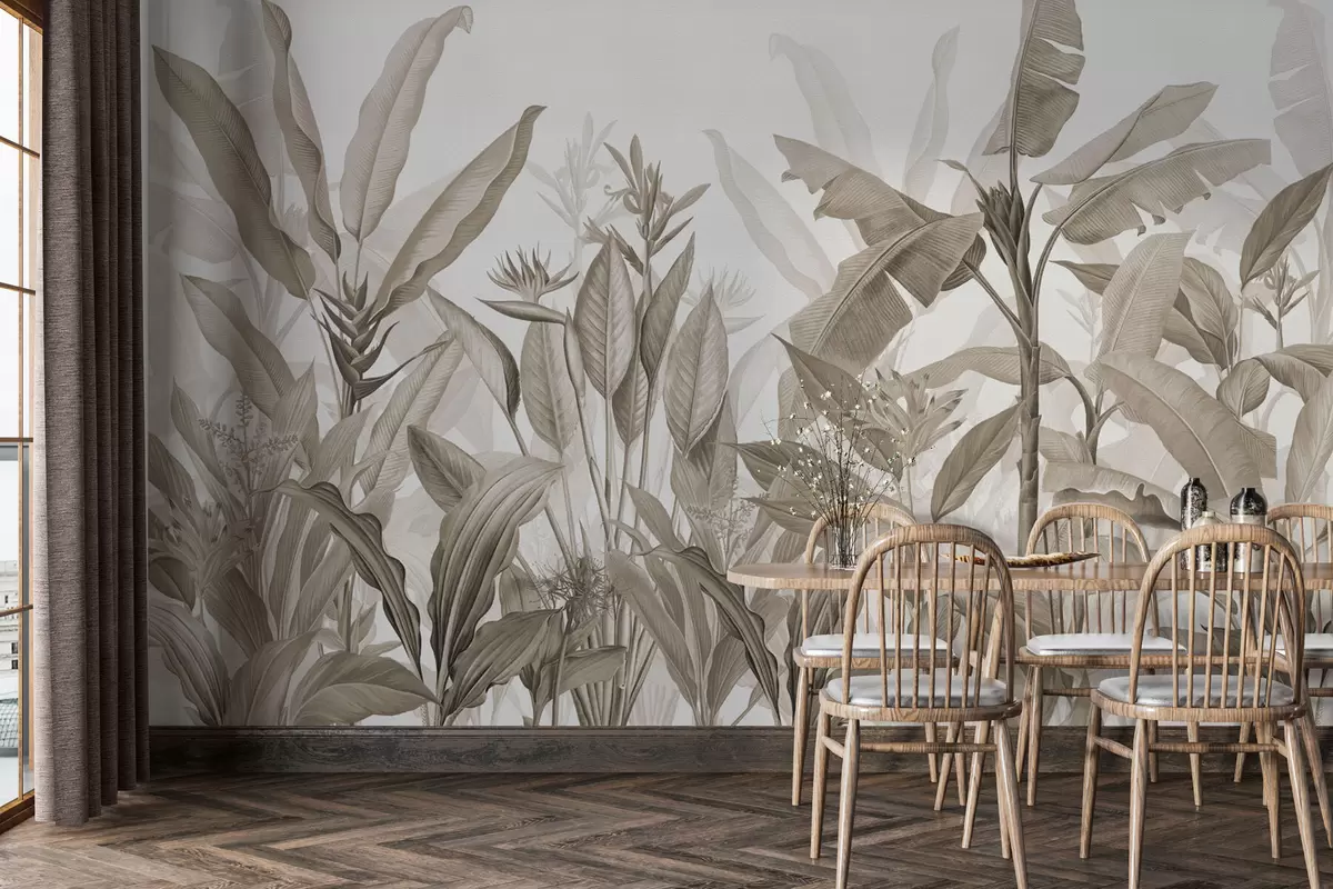 Тапете за зид Тропско лишће и цвеће на светлој позадини у стилу сепије бр. w01834v4