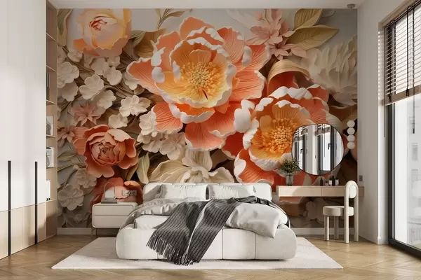 Тапете за зид 3Д цветни аранжман у тоновима брескве са божурима и ружама у рококо стилу бр. w01939