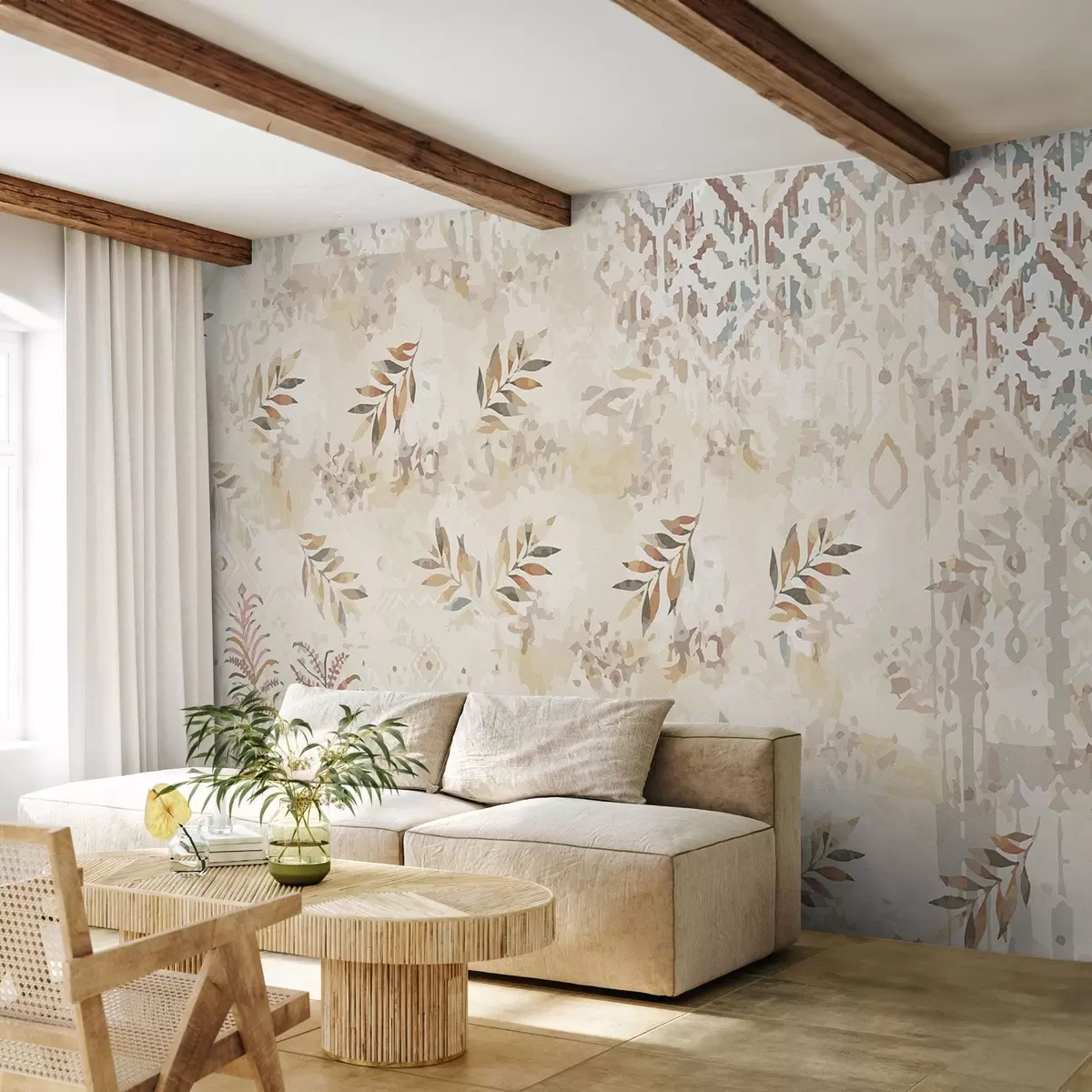 Тапете за зид Тапете у ретро стилу са шарама, елементима абразије, мрља и листова, у беж бојама бр. w01955