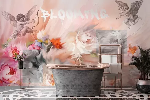 Тапете за зид Цветање цвећа, божури, мали Купидони са стрелицама, акрилна уметност бр. w02023