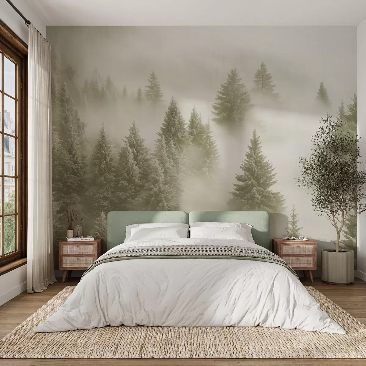 Тапете за зид Густа магла обавија снежну јутарњу шуму у меким зеленим нијансама бр. w02064v2