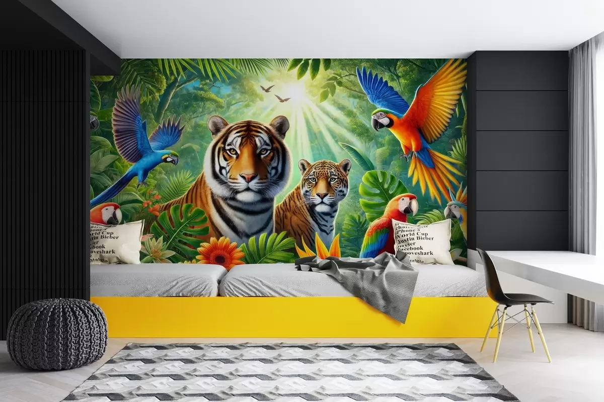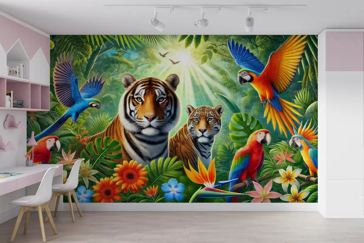 Тапете за зид Шарени зидни мурал са панорамом тропских крајева са паром тигрова, папагаја и цвећа бр. w02083