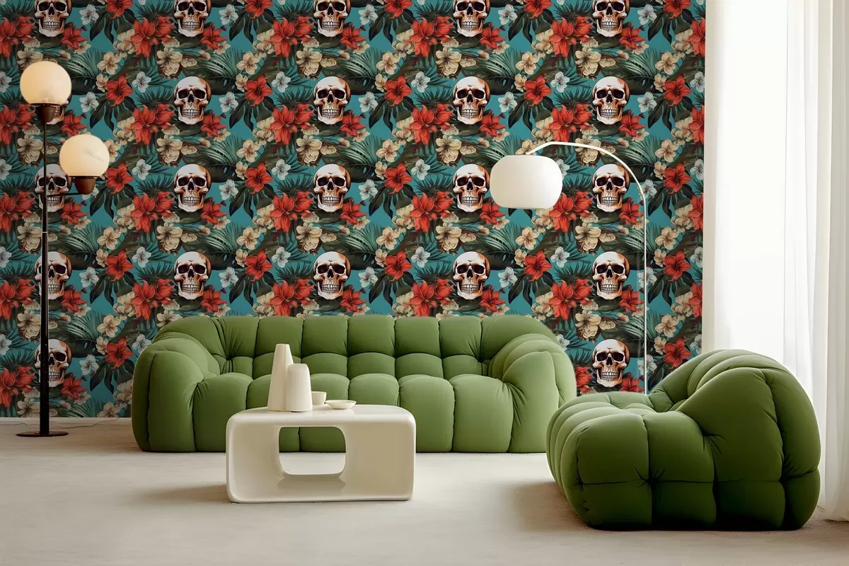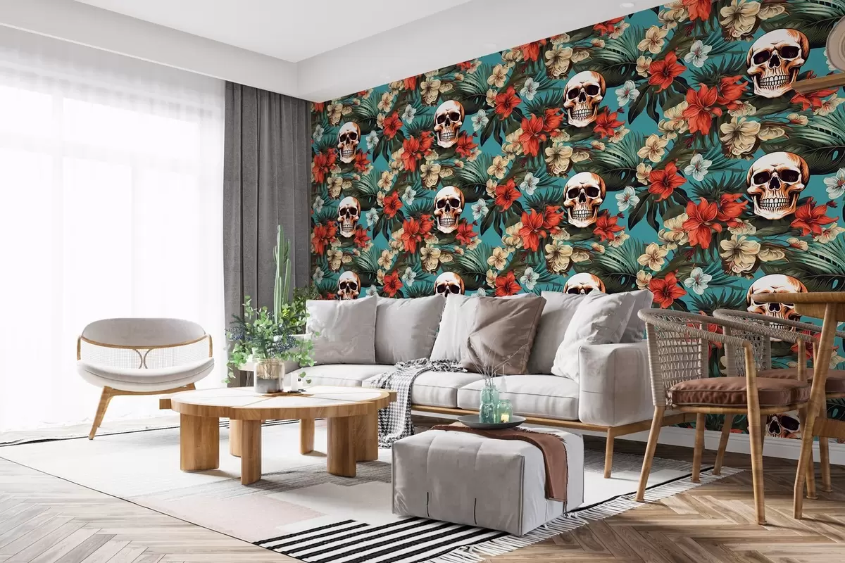 Тапете за зид Узорак у тропским простиркама са цвећем и лобањама бр. w02122