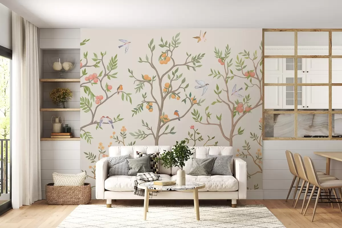Тапете за зид Цхиноисерие дизајн са птицама, вијугавим дрвећем, воћем и цвећем бр. w02128