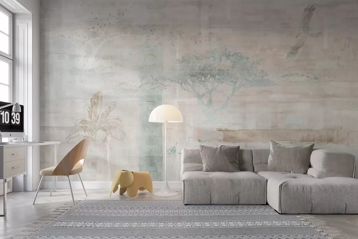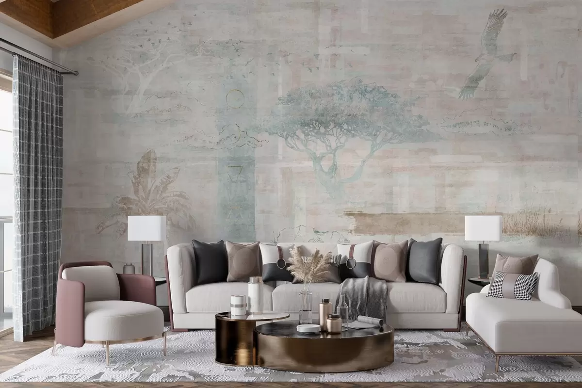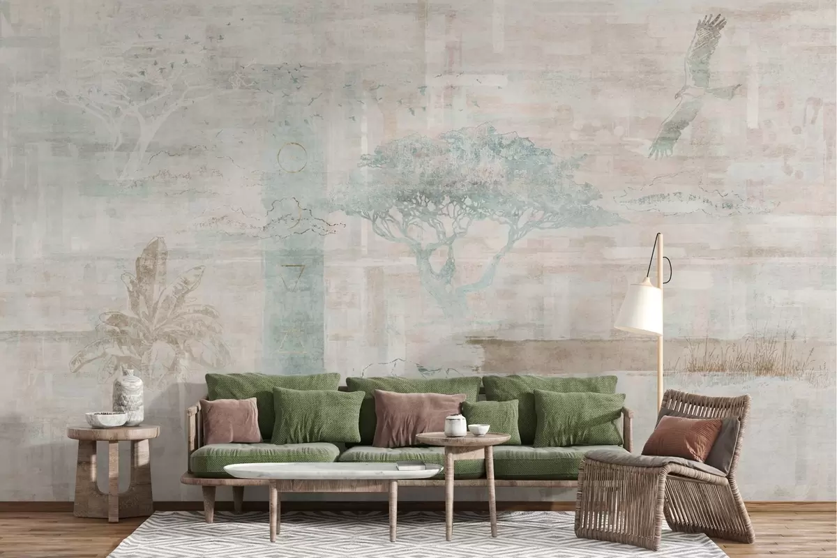 Тапете за зид Винтаге дизајн грунге ефекта са дрвећем, орлом и геометријским елементима бр. w02130