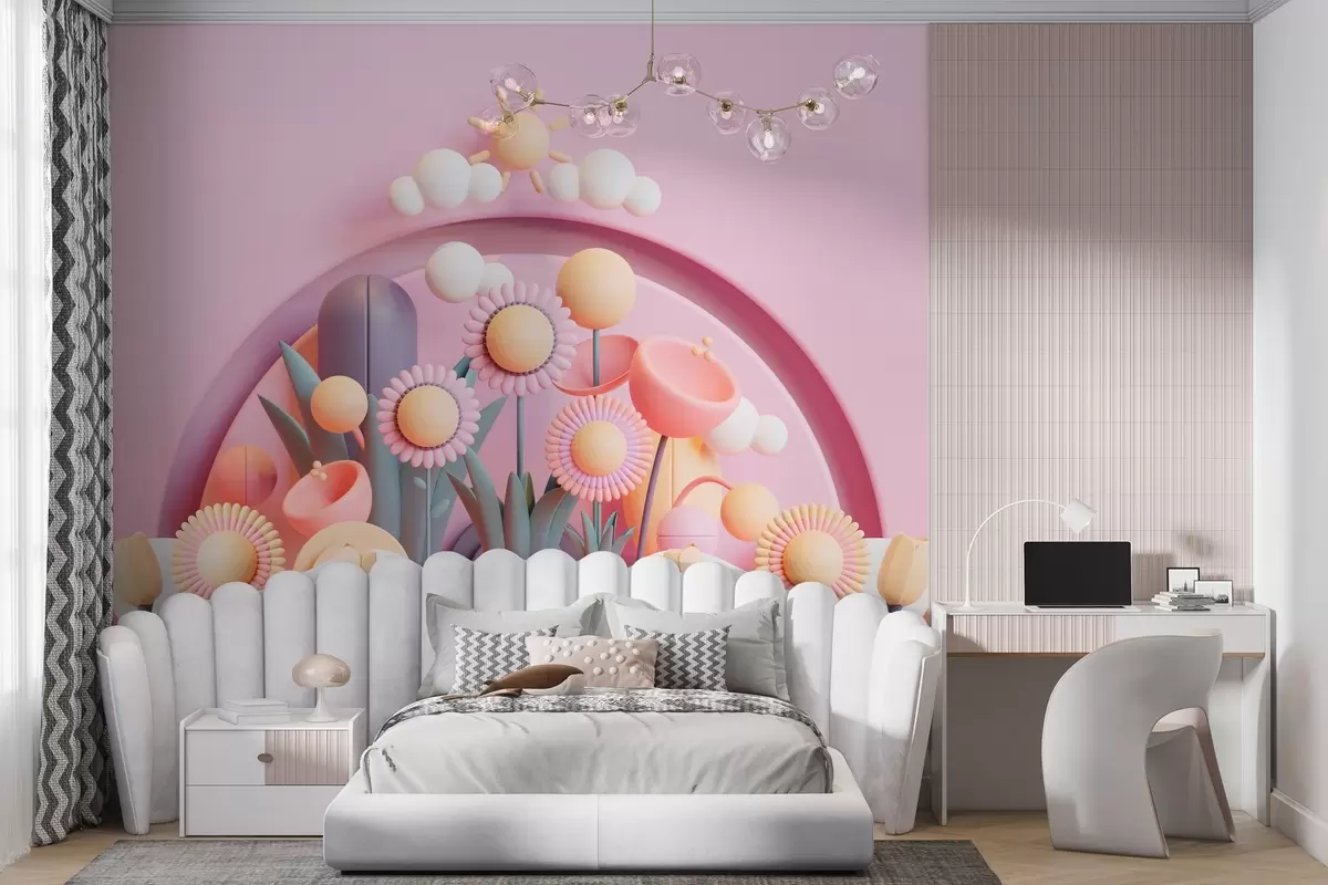 Тапете за зид Дечија тапета у 3Д стилу са цвећем и облацима у ружичастим нијансама бр. w02136