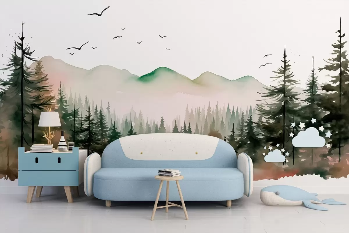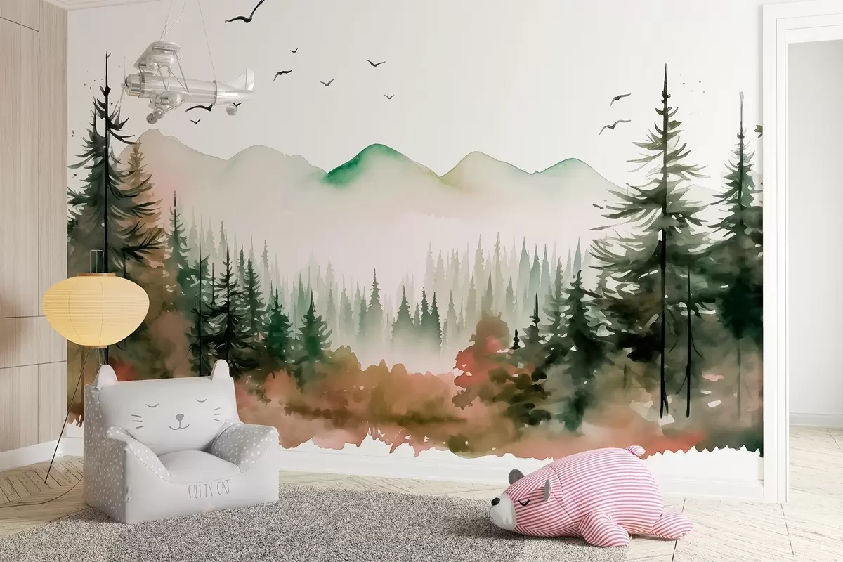Тапете за зид Акварел шумски и планински пејзажи, зелене и розе боје бр. w02150v1