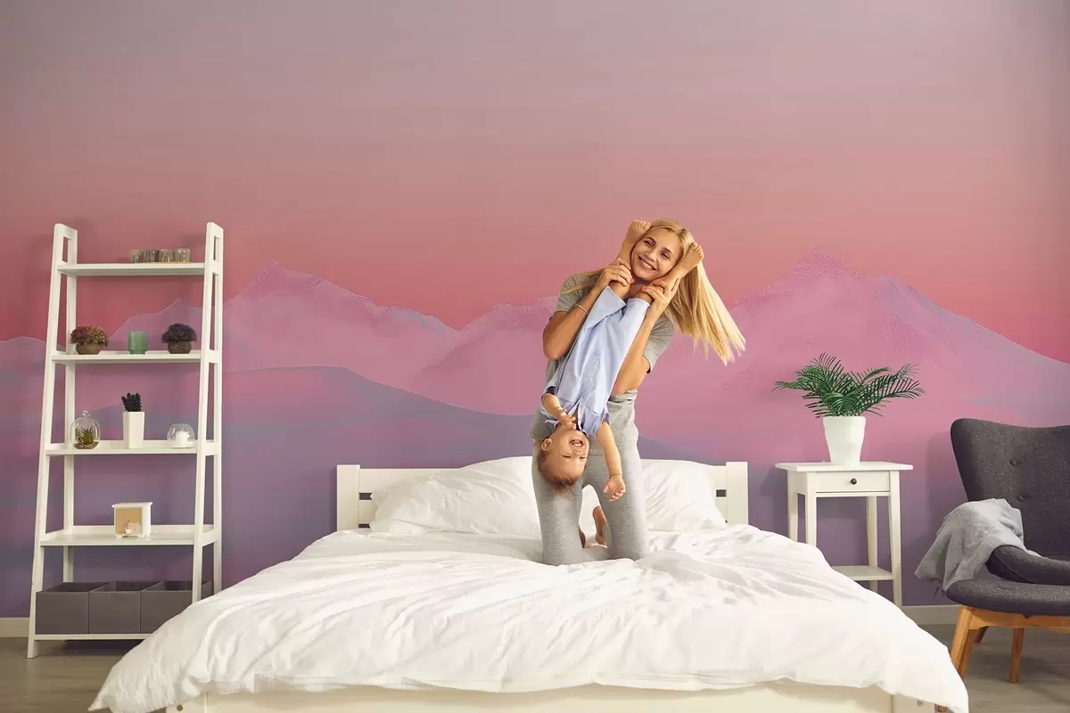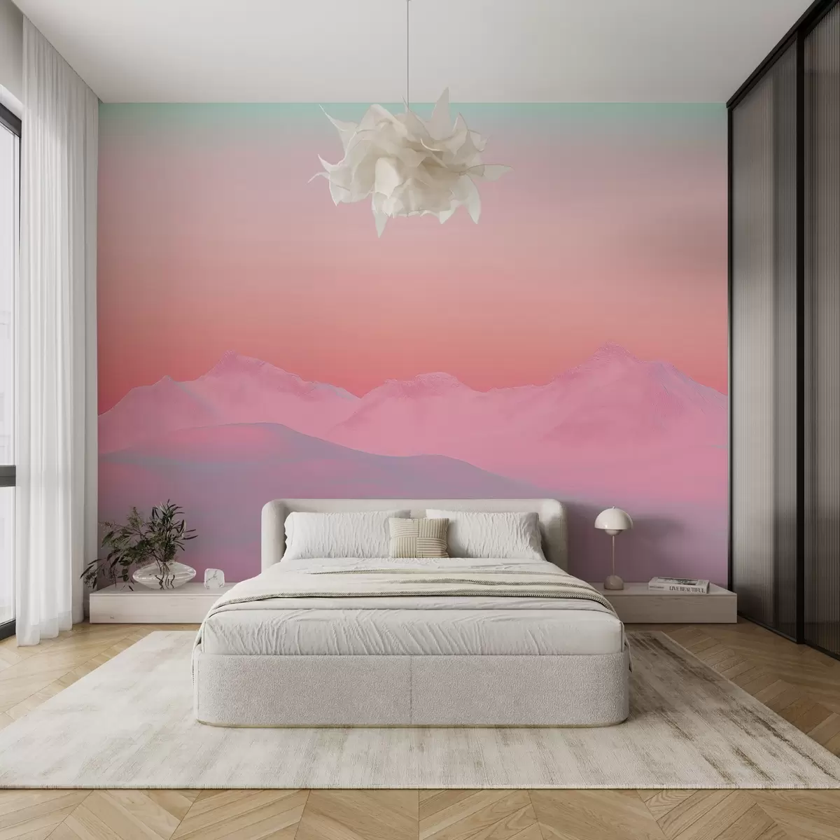 Тапете за зид Меки залазак сунца у облику малине на позадини планина и неба бр. w02234