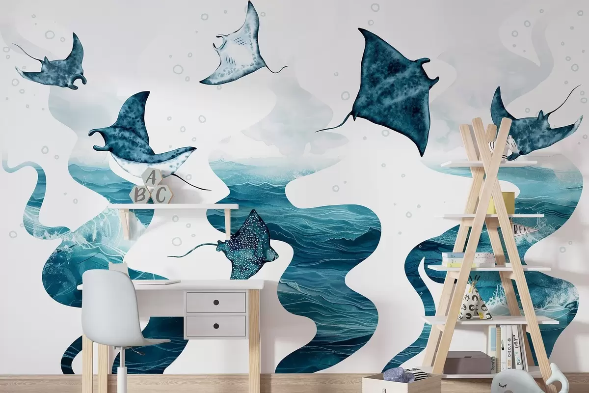 Тапете за зид Риба манта, акварел стил, море, океан, плаве боје бр. w02266