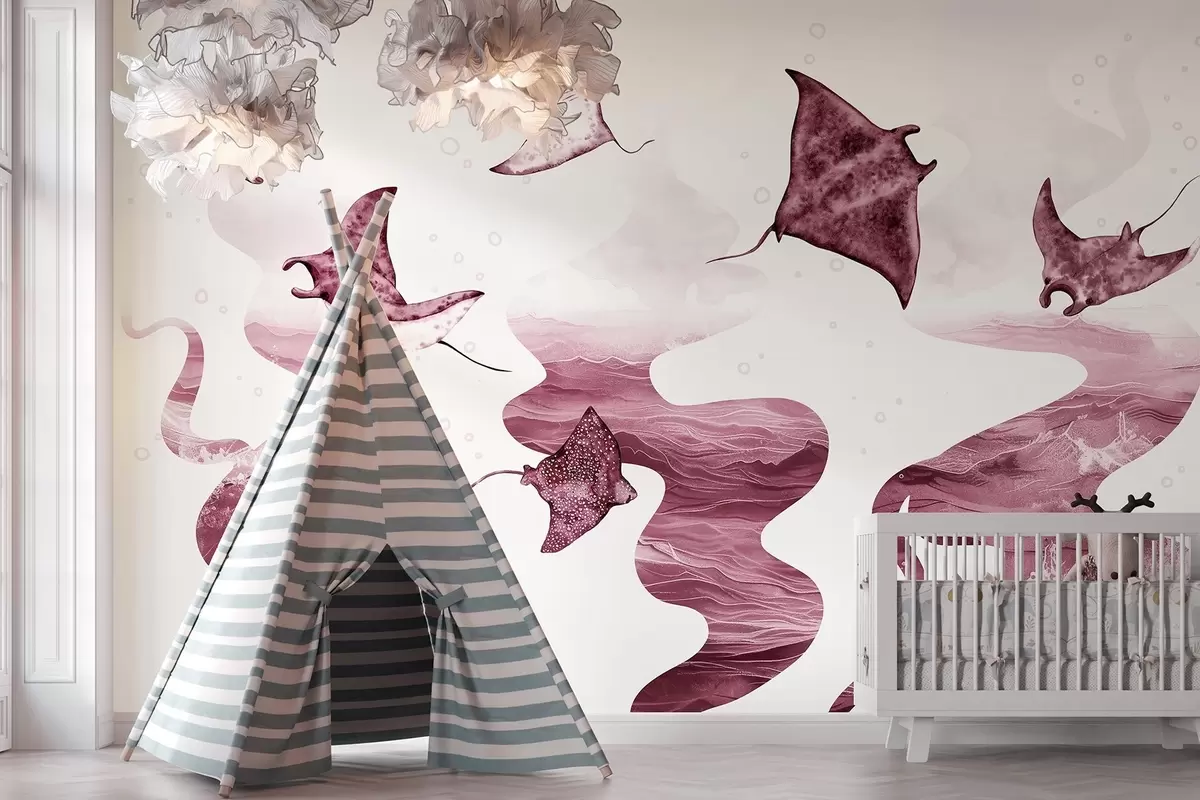 Тапете за зид Риба манта, акварел стил, море, океан, розе боје бр. w02266v3
