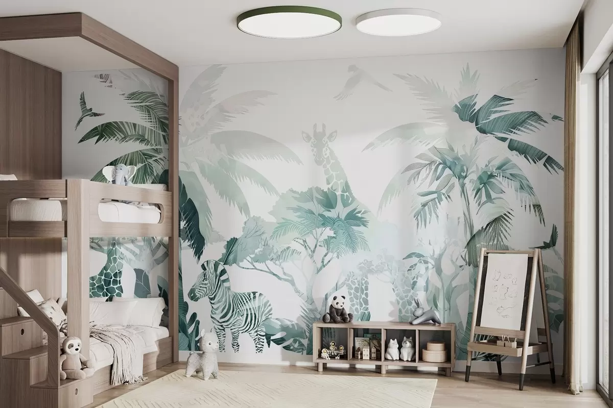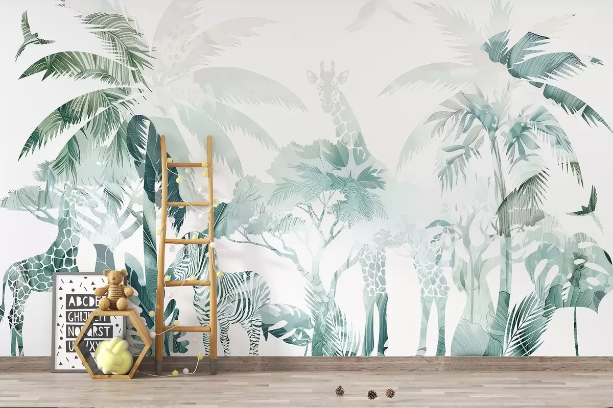 Тапете за зид Сафари животиње, палме, џунгле, зебра, жирафа, нежне зелене боје бр. w02267
