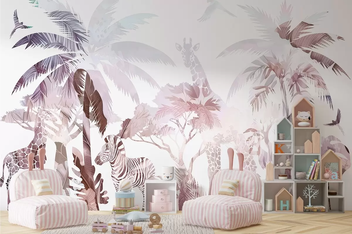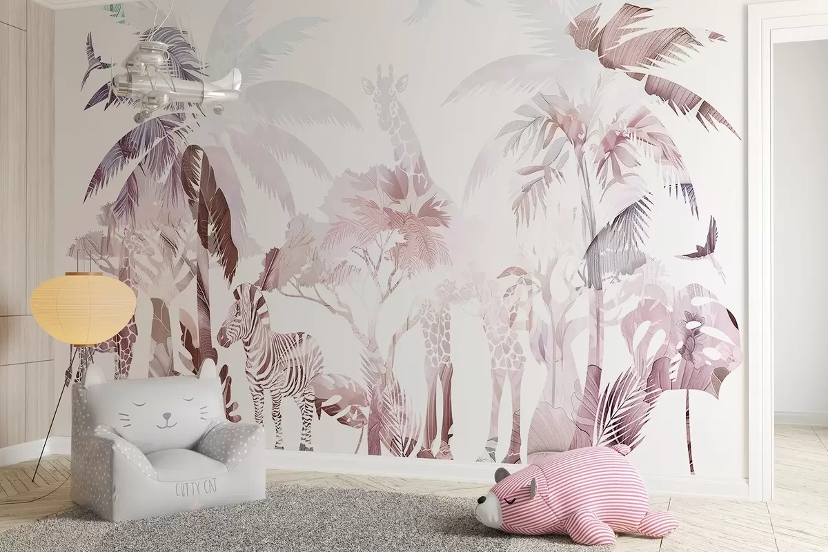 Тапете за зид Сафари животиње, палме, џунгле, зебра, жирафа, нежно розе боје бр. w02267v1