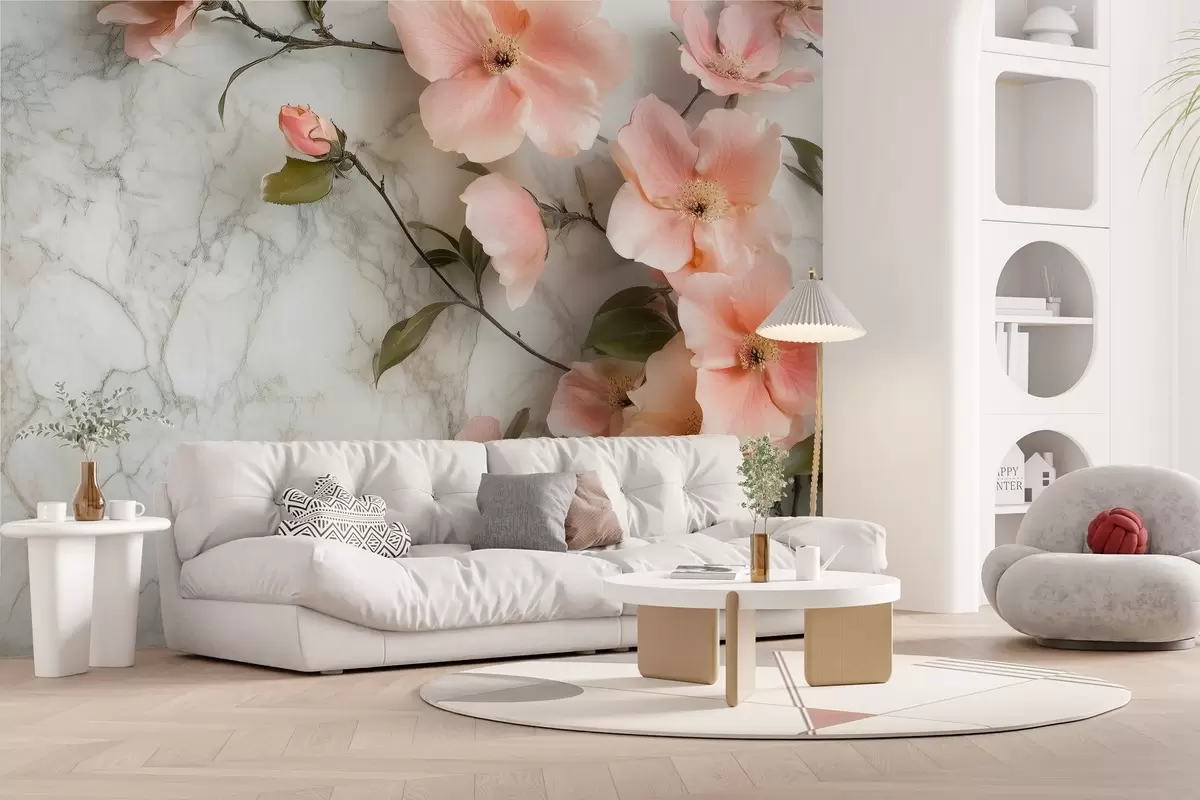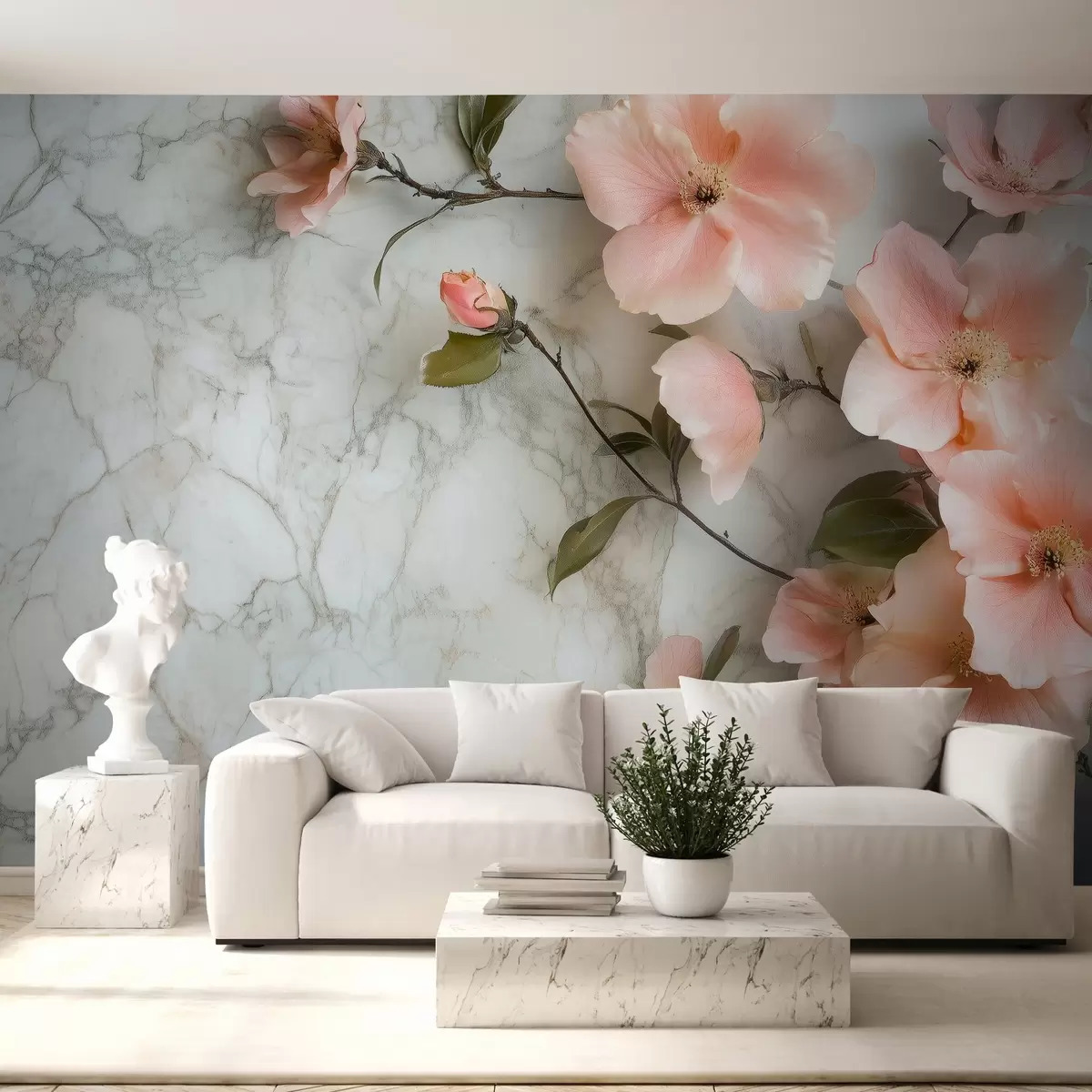 Тапете за зид Нежно цвеће на позадини имитације мермера бр. w02291