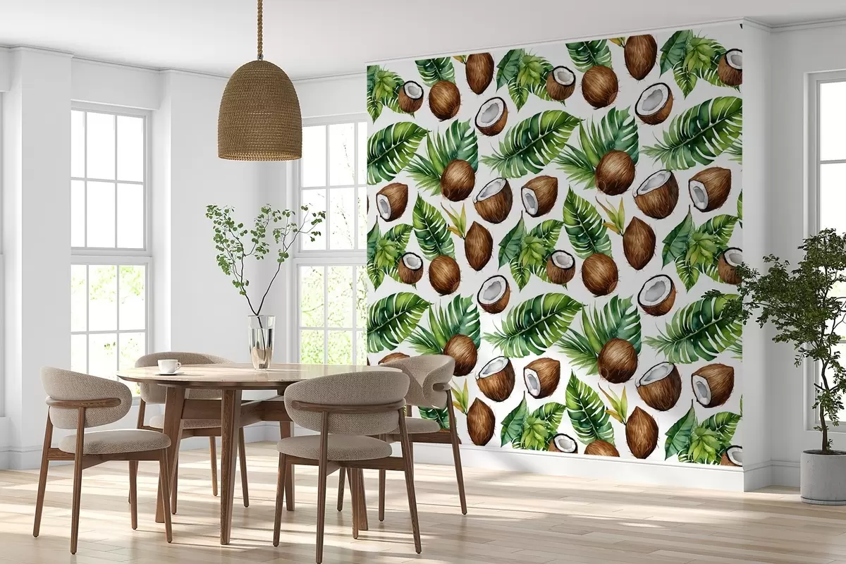 Тапете за зид тропски узорак са кокосом и лишћем бр. w02293