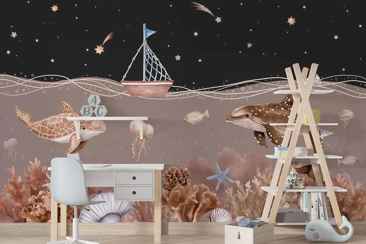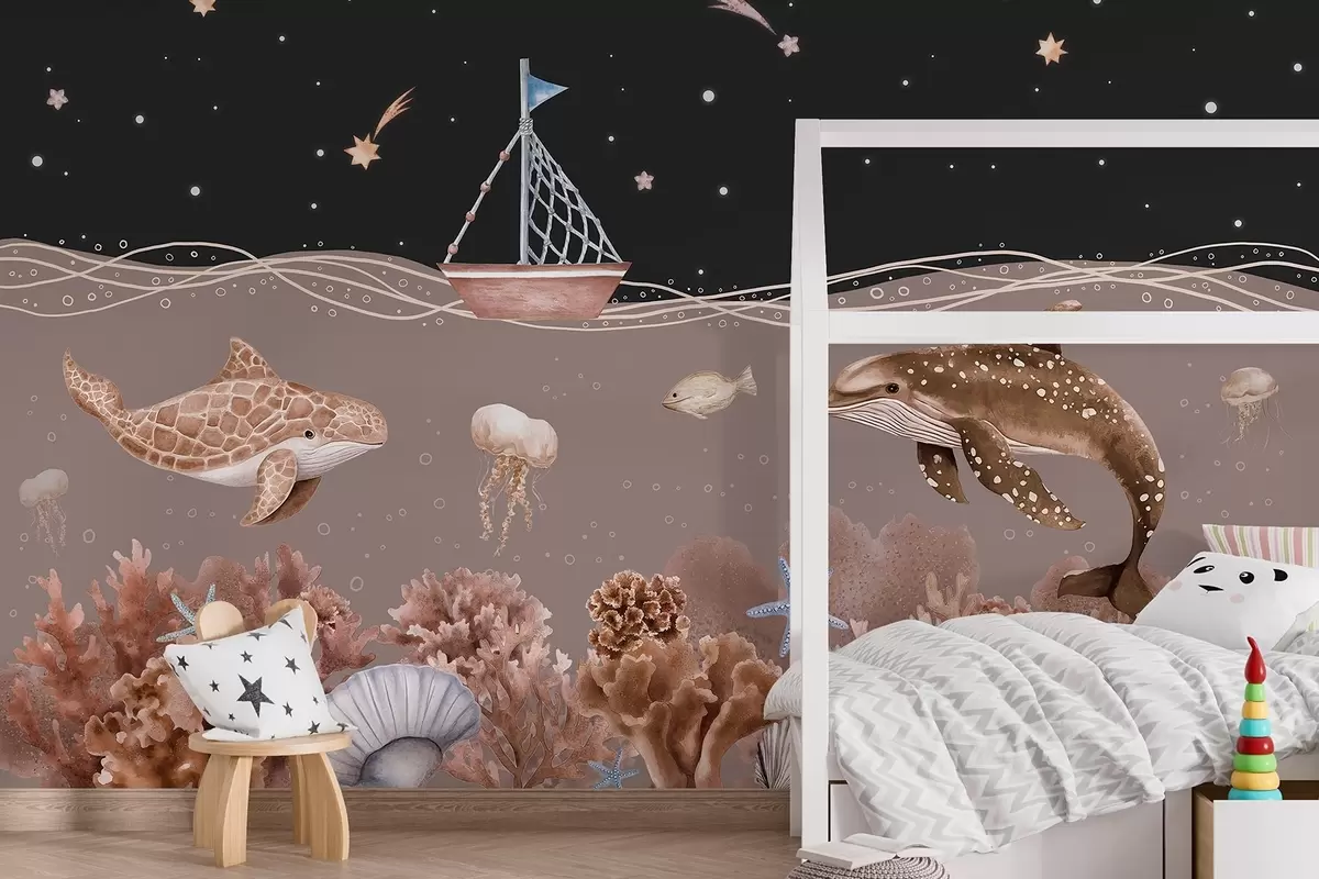 Тапете за зид Морски живот, стил акварела, корали, чамац, делфин, медузе, звездано ноћно небо, беж боје бр. w02310v1