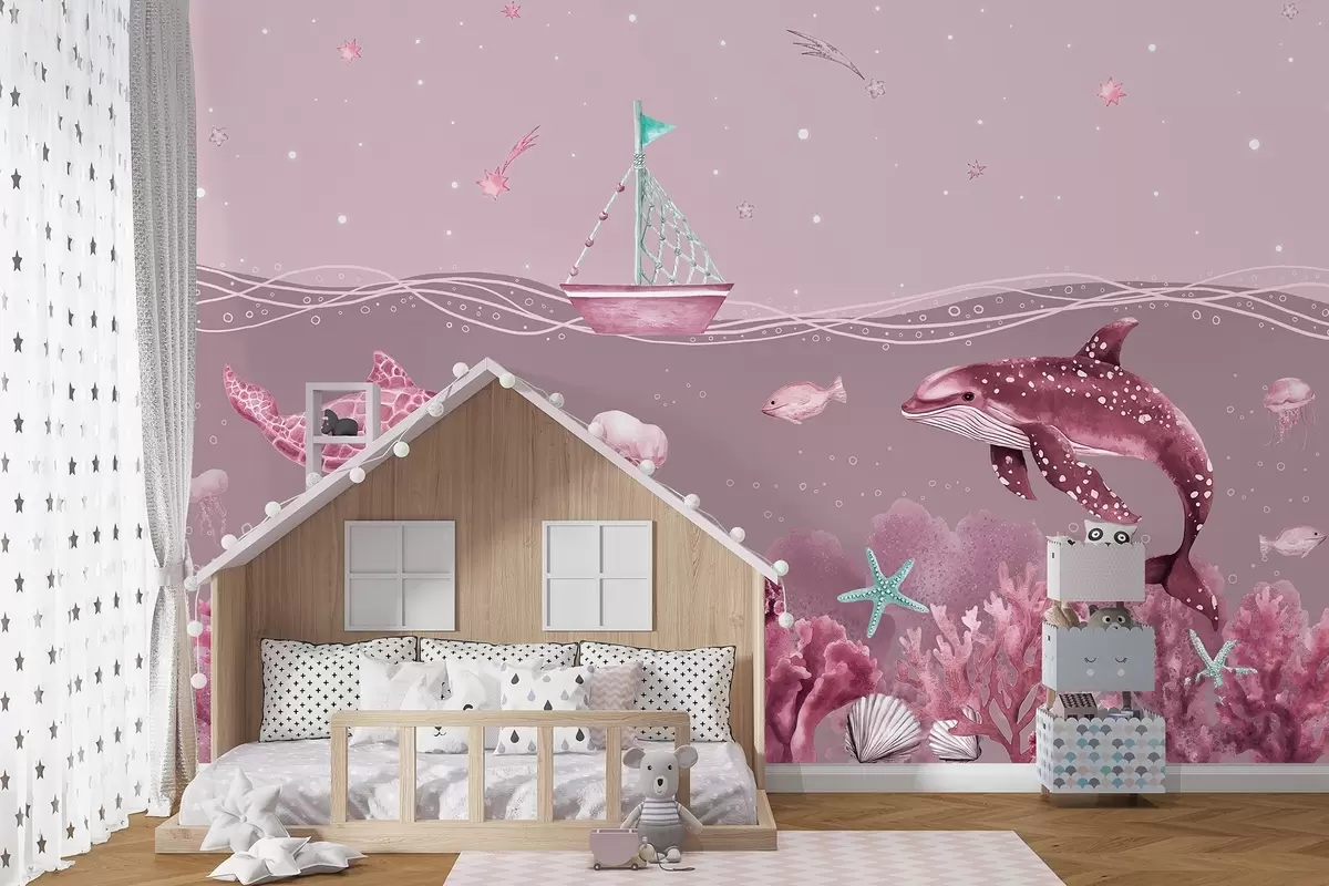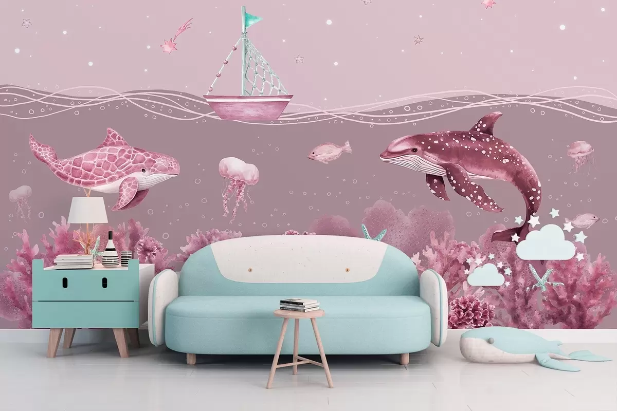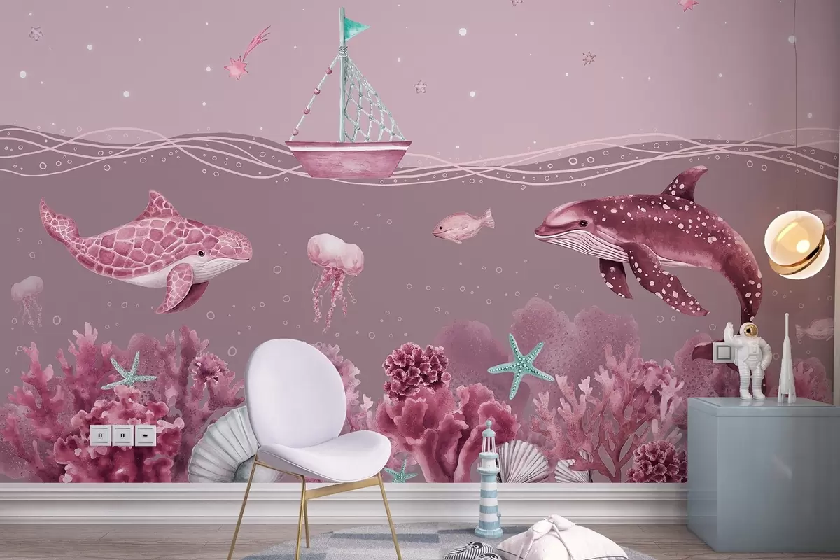 Тапете за зид Морски живот, стил акварела, корали, чамац, делфин, медузе, звездано небо, розе боје бр. w02310v2