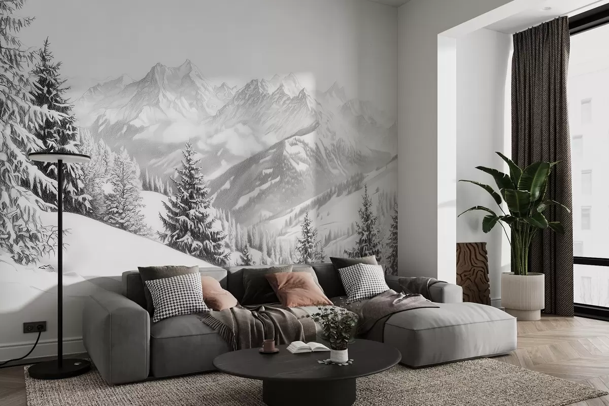 Тапете за зид Зима у планинама, шума, Алпи, цртеж у стилу оловке, пејзажи природе бр. w02353