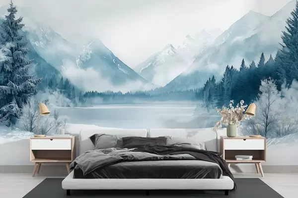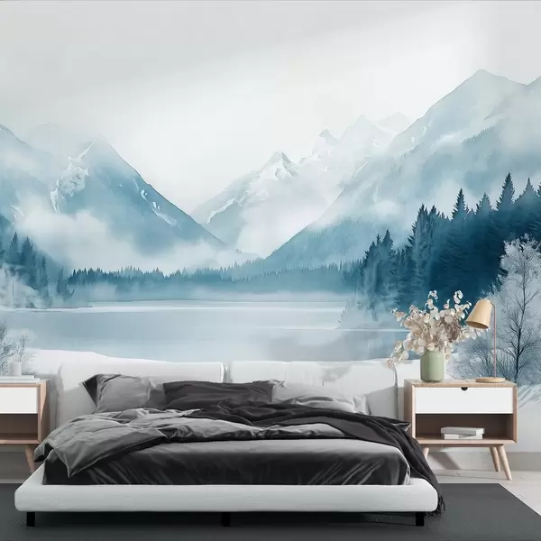 Тапете за зид Зимске планине, залеђено језеро, борова шума, плава палета боја, акварел стил бр. w02354