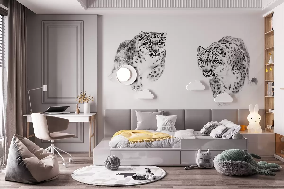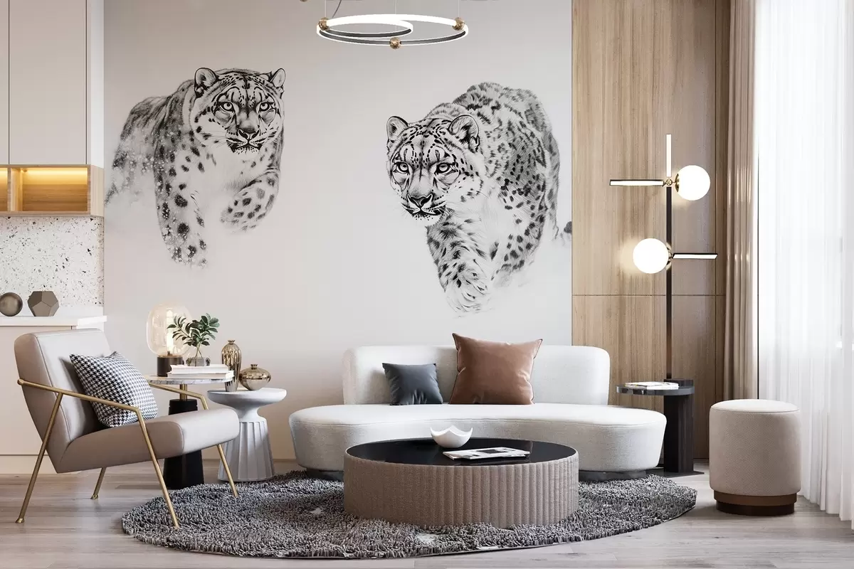 Тапете за зид Снежни леопарди, зима, дивље животиње, цртеж у стилу оловке, минимализам бр. w02359