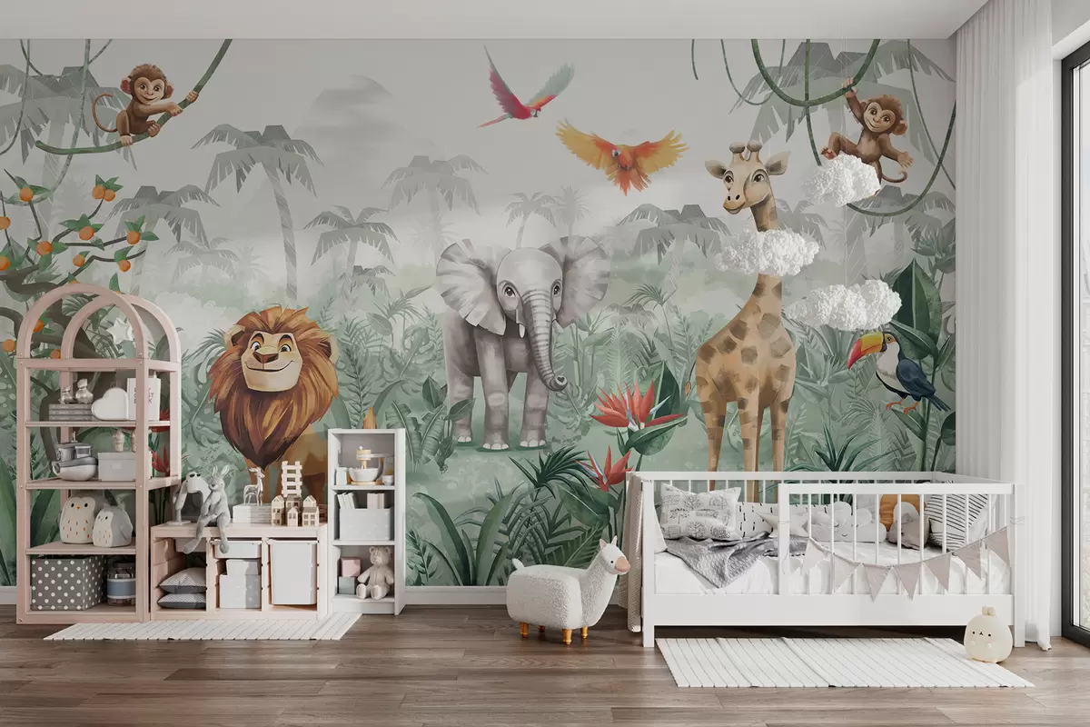 Тапете за зид Дечји дизајн џунгле са лавом, жирафом, слоном и папагајем бр. w02440