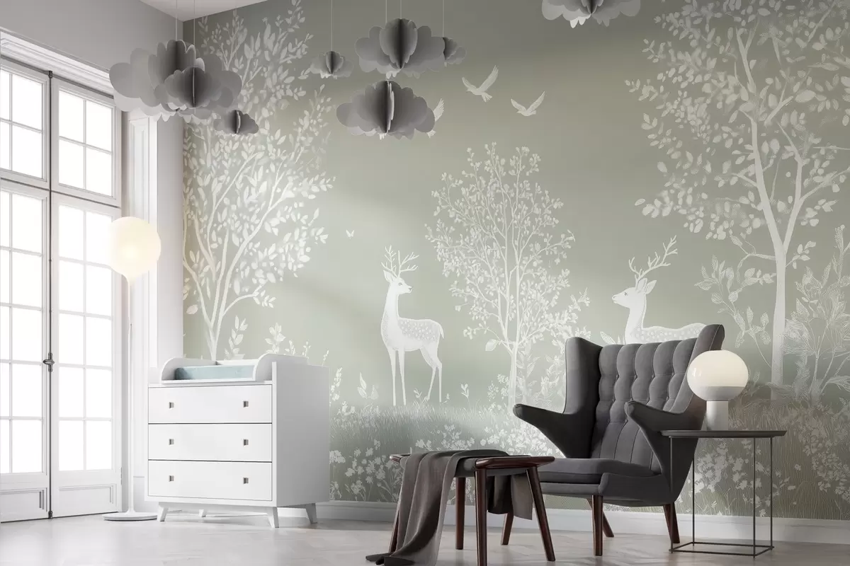 Тапете за зид шума са јеленима у стилу цртежа кредом на позадини маслине бр. w02444v1