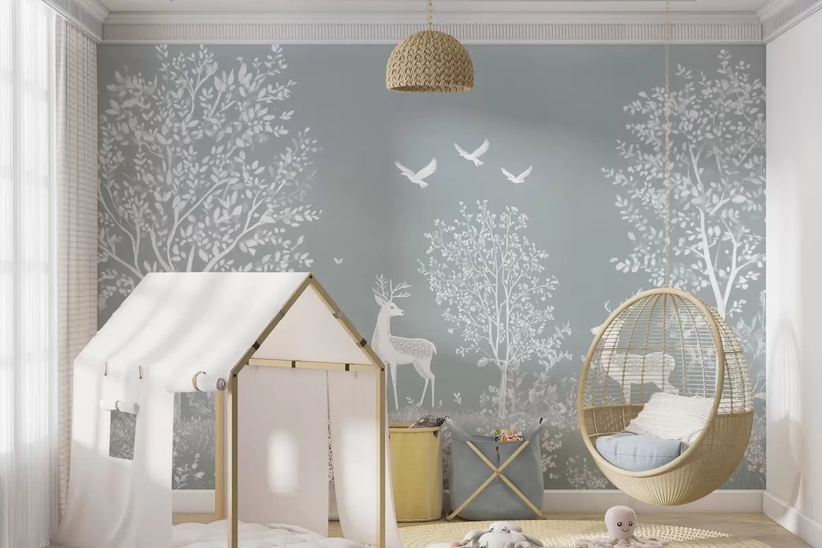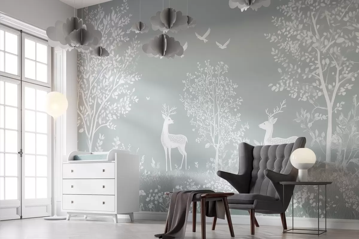 Тапете за зид шума са јеленима у стилу цртежа кредом на сивој позадини бр. w02444v2
