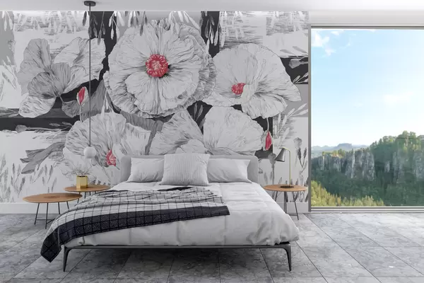 Тапете за зид Црно-бели цветови са црвеним средиштима бр. w02477