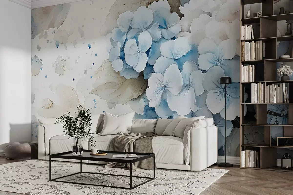 Тапете за зид Цртеж у акварелу цвећа хортензије са листовима, нежне природне боје бр. w02493