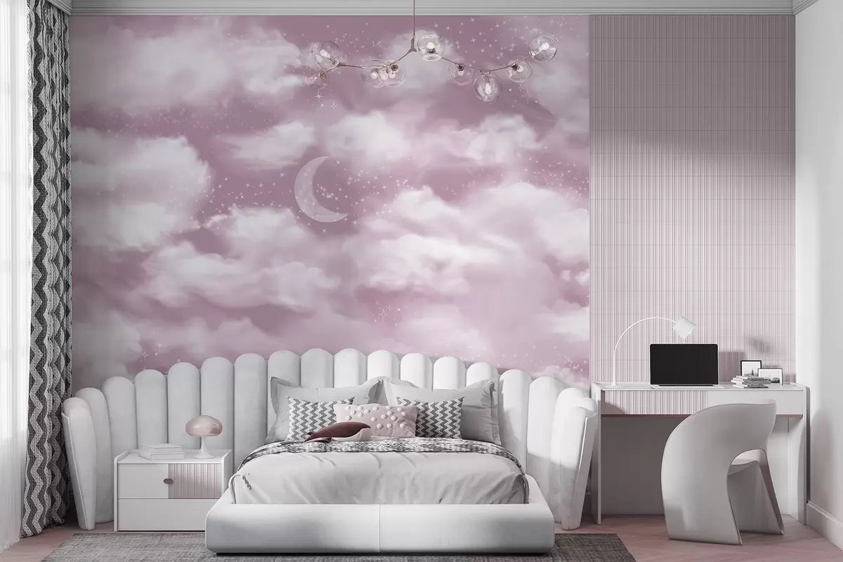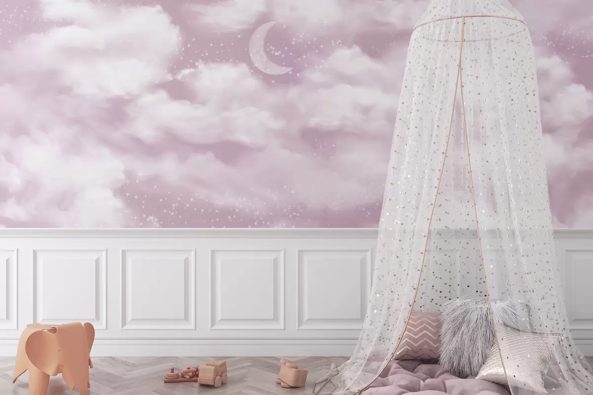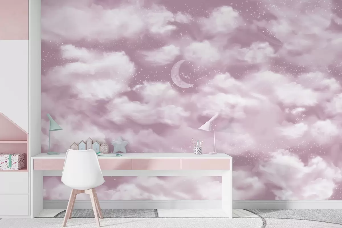 Тапете за зид Звездано небо са месецом и облацима, сањиве, етеричне, нежно розе боје бр. w02515v3