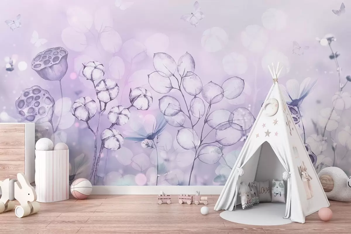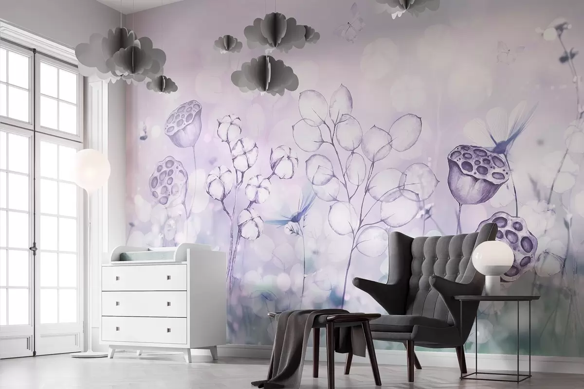 Тапете за зид Сањиви цветни врт, лептир, цвеће памука, лотоси, љубичасте боје бр. w02516v1