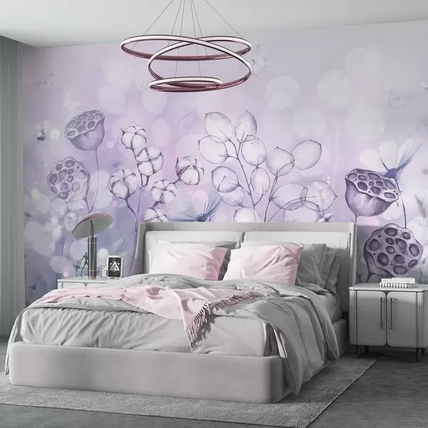 Тапете за зид Сањиви цветни врт, лептир, цвеће памука, лотоси, љубичасте боје бр. w02516v1