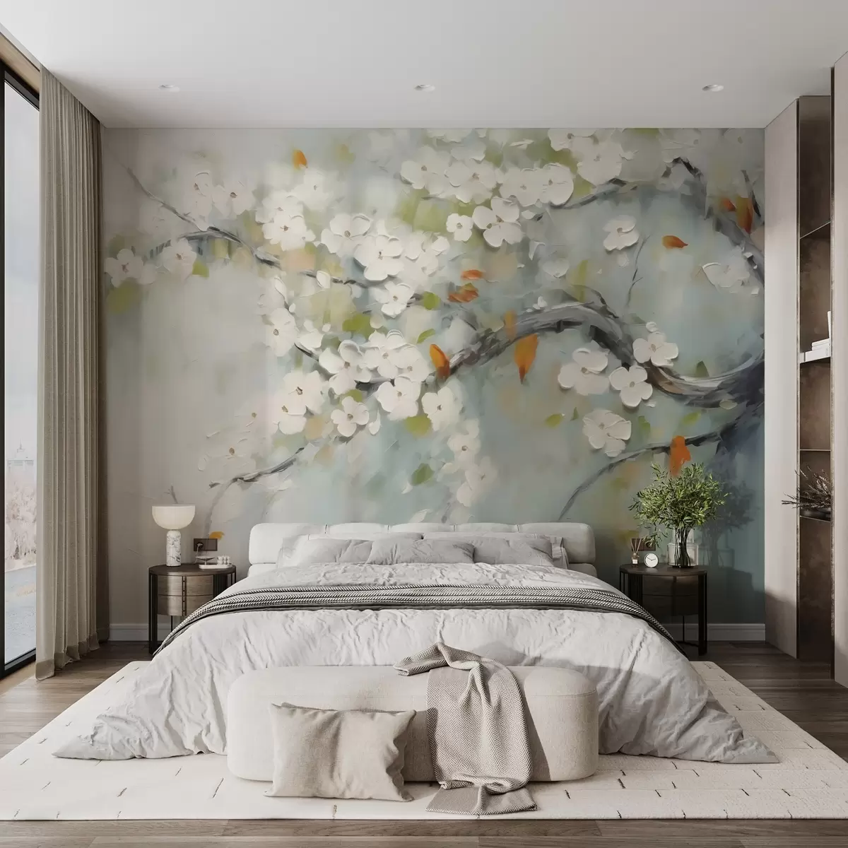 Тапете за зид Грана са белим цветовима имитација сликарских потеза бр. w02589