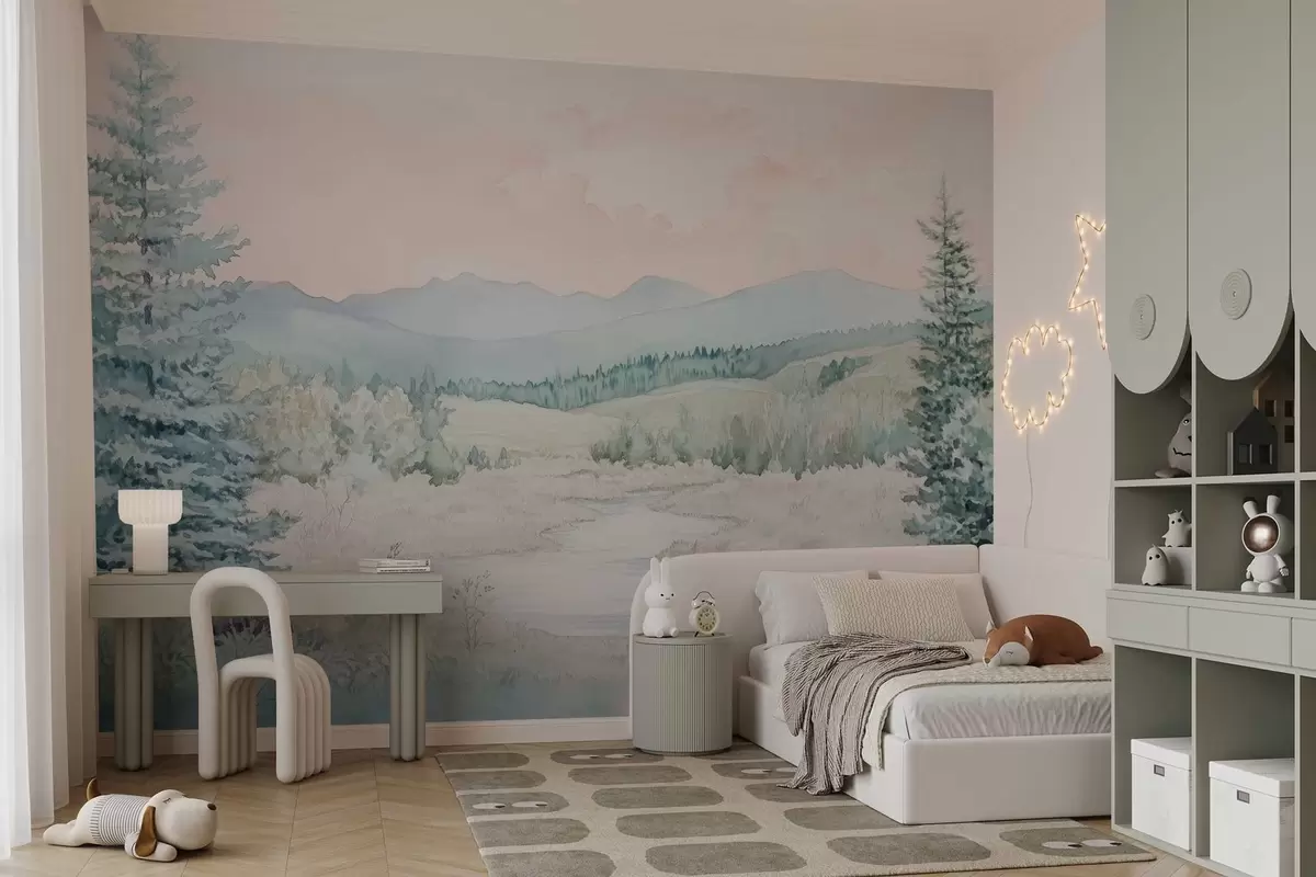 Тапете за зид пејзаж у стилу акварела са јелима бр. w02689