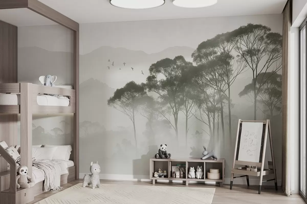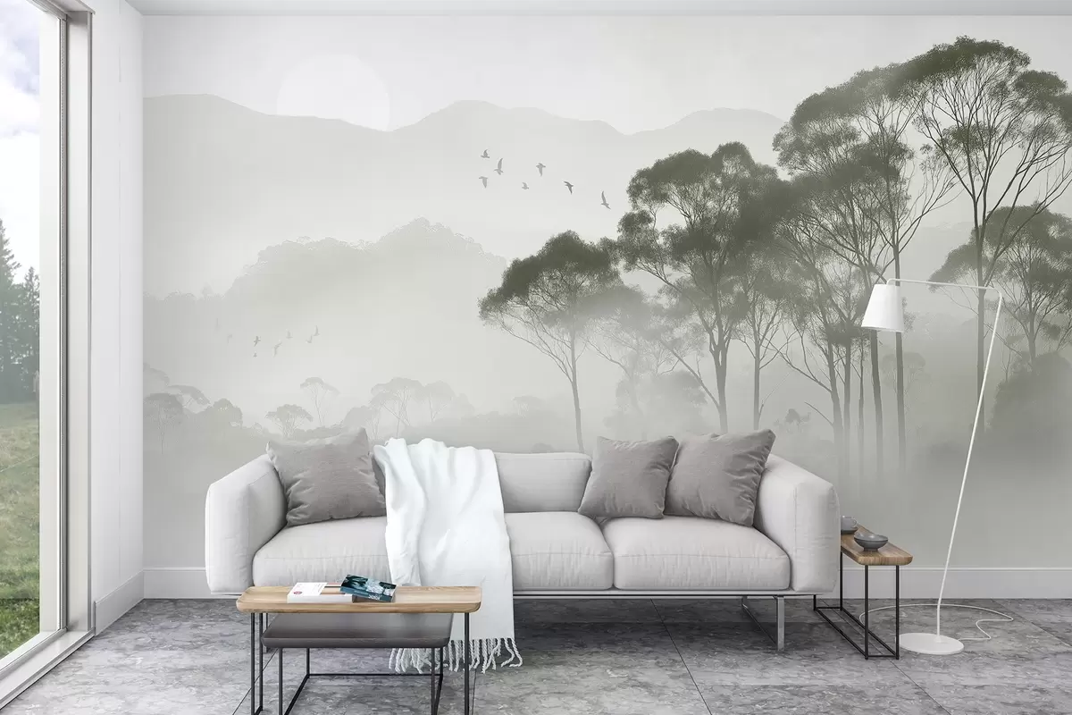 Тапете за зид Дрвеће у магли, пејзажи природе, птице, сунце, зелене боје бр. w02740